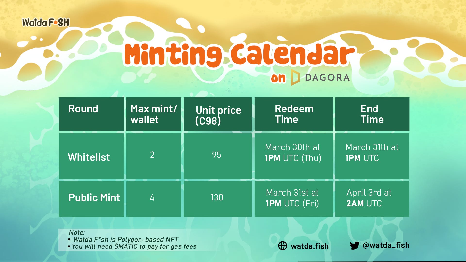 Let’s take a closer look at the minting calendar for the Watda F*sh NFT collection, with a breakdown of the key details for each round.