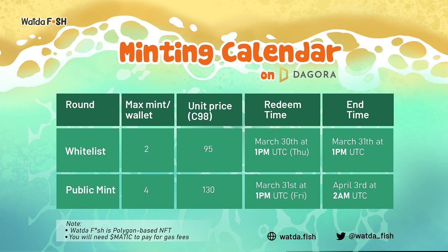 Now, it's time to dive deep into the minting calendar for the Watda F*sh NFT collection. Min Chou here to break down all the juicy details for you!